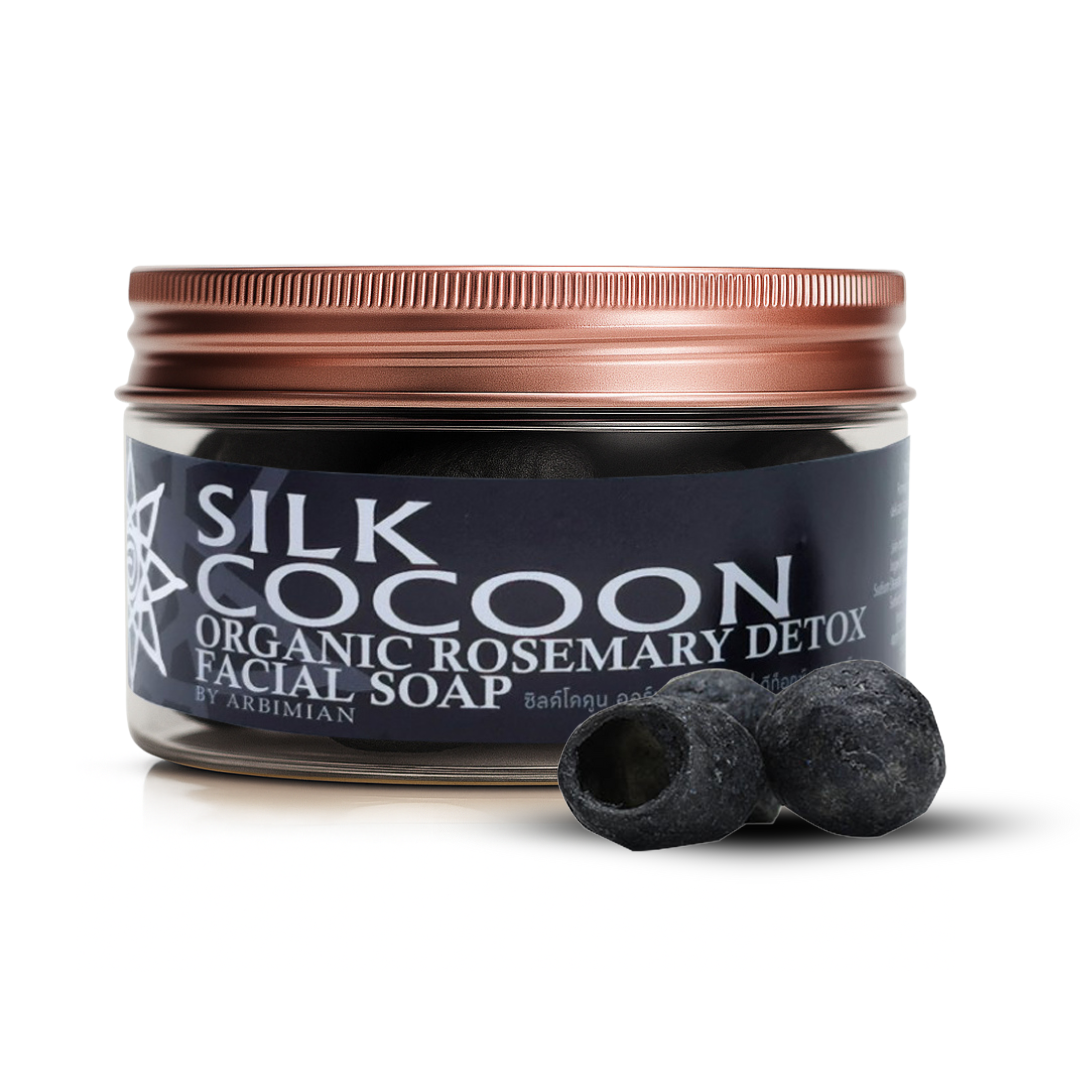 Contains 24 pcs. Gross Weight 102 g. Size 9.0 x 9.0 x 5.7 cm. Registration No 12-1-6500033381 Silk Cocoon Organic Rosemary Facial Soap 24 - Detox Properties : Silk Cocoon Soap with Bamboo Charcoal, Detoxifying Formula, reduces facial impurities which lead to acne. The creamy and delicate later is made from natural ingredients. It is free from any foaming agent, SLS SLES and Parabens. The soap contains sorbitol to retain skin moisture. Your face feels soft and moisturized immediately after use. Ingredients : Silkworm Cocoon, Water, Propylene Glycol, Glycerin, Sorbitol, Sodium Stearate, Sodium Cocoyl Isethionate, Sodium Myristate, Sodium Palmitate, Sodium Laurate, Fragrance, PEG-90M, Charcoal Powder. Instructions : Wet the face, insert a finger into the cocoon and gently apply on the face. Lather up until the face is thoroughly clean. Rinse off. Once the soap is used up, the remaining silk cocoon may be used for facial scrub and massage. (One piece of soap lasts 3-5 days). Storage : Keep at room temperature away from heat and direct sunlight.